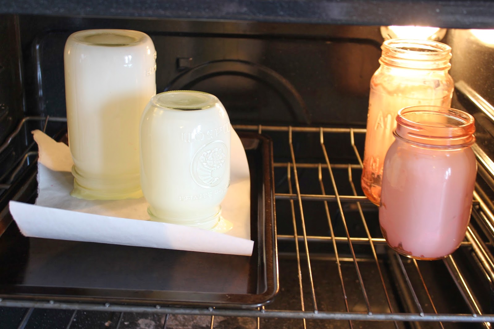 4. When ready, place the jar upside down on baking sheet with wax paper in the oven. Bake for 3 minutes. When done, turn the jar right side up. Carefully wipe the excess water and mod podge mixture from the lip of the jar with a paper towel. Then place the jar right side up in the oven and bake for an additional 30-40 minutes, or until the stain is clear on the jar. If you’re not sure if its done, a bit of extra time doesn’t harm it.