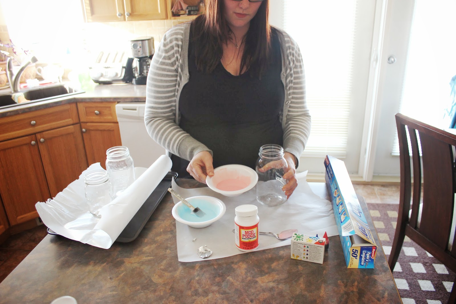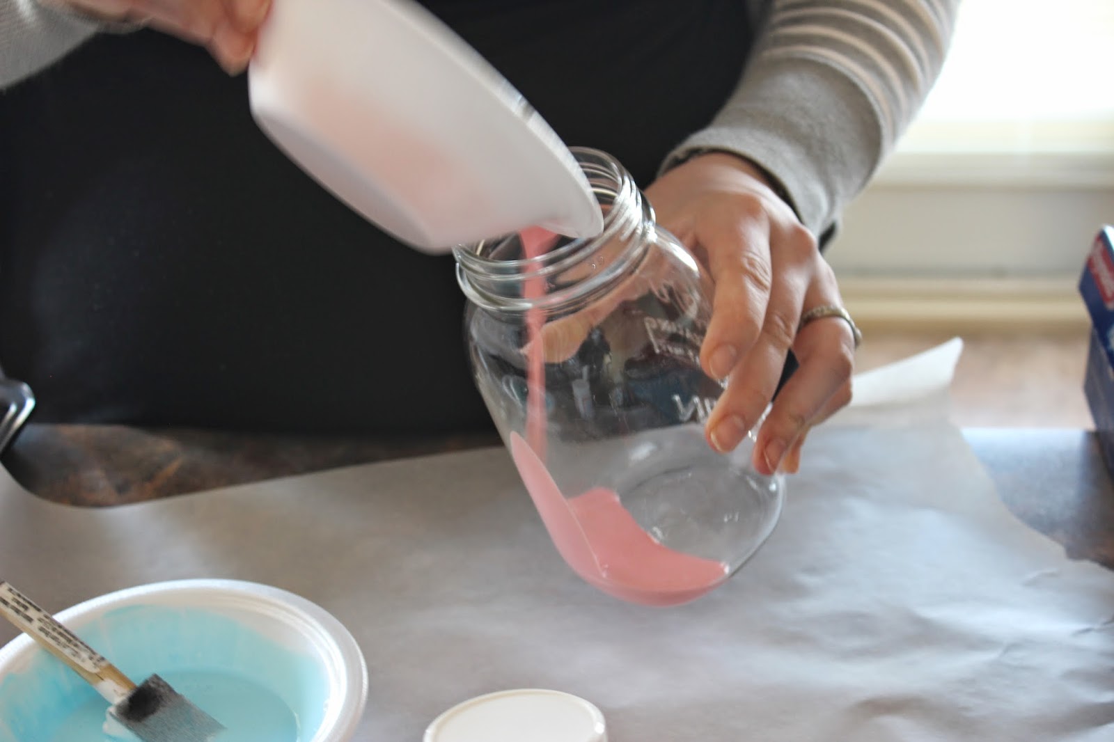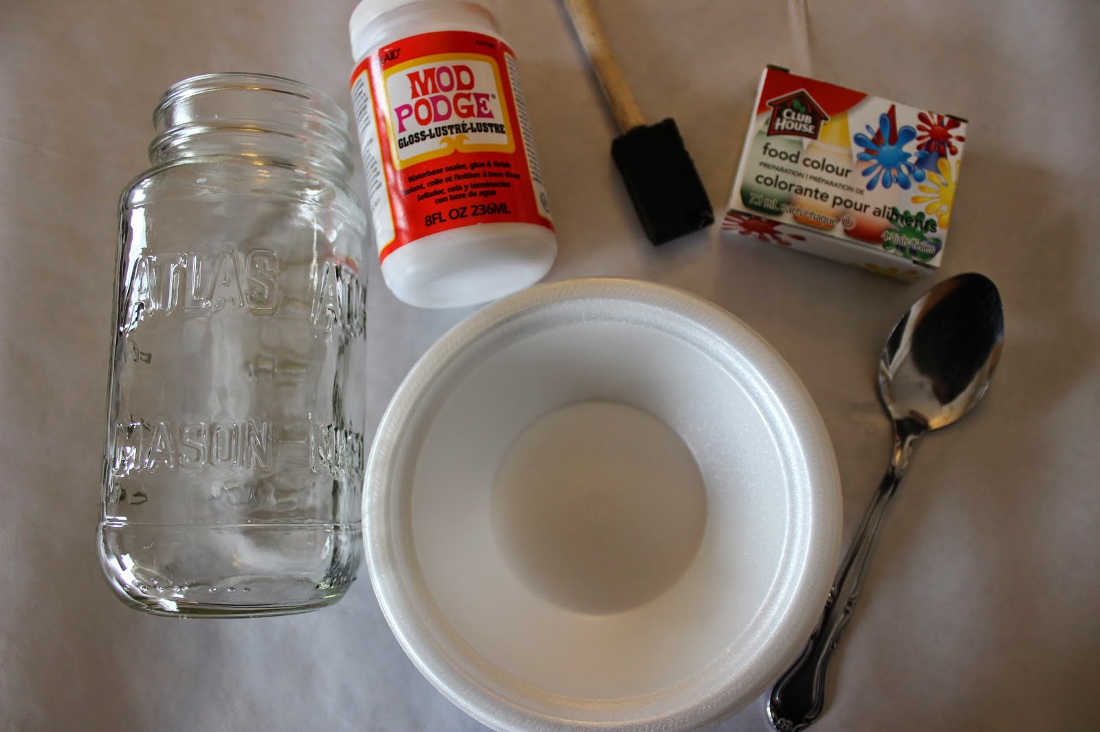 1. Preheat oven to 200F. In a paper bowl, mix together 2 tbsp of water and 4 tbsp of mod podge. Stir until mixed with a foam brush or spoon. Add food colouring to get the desired tint. I added 4 drops for each of my jar colours.