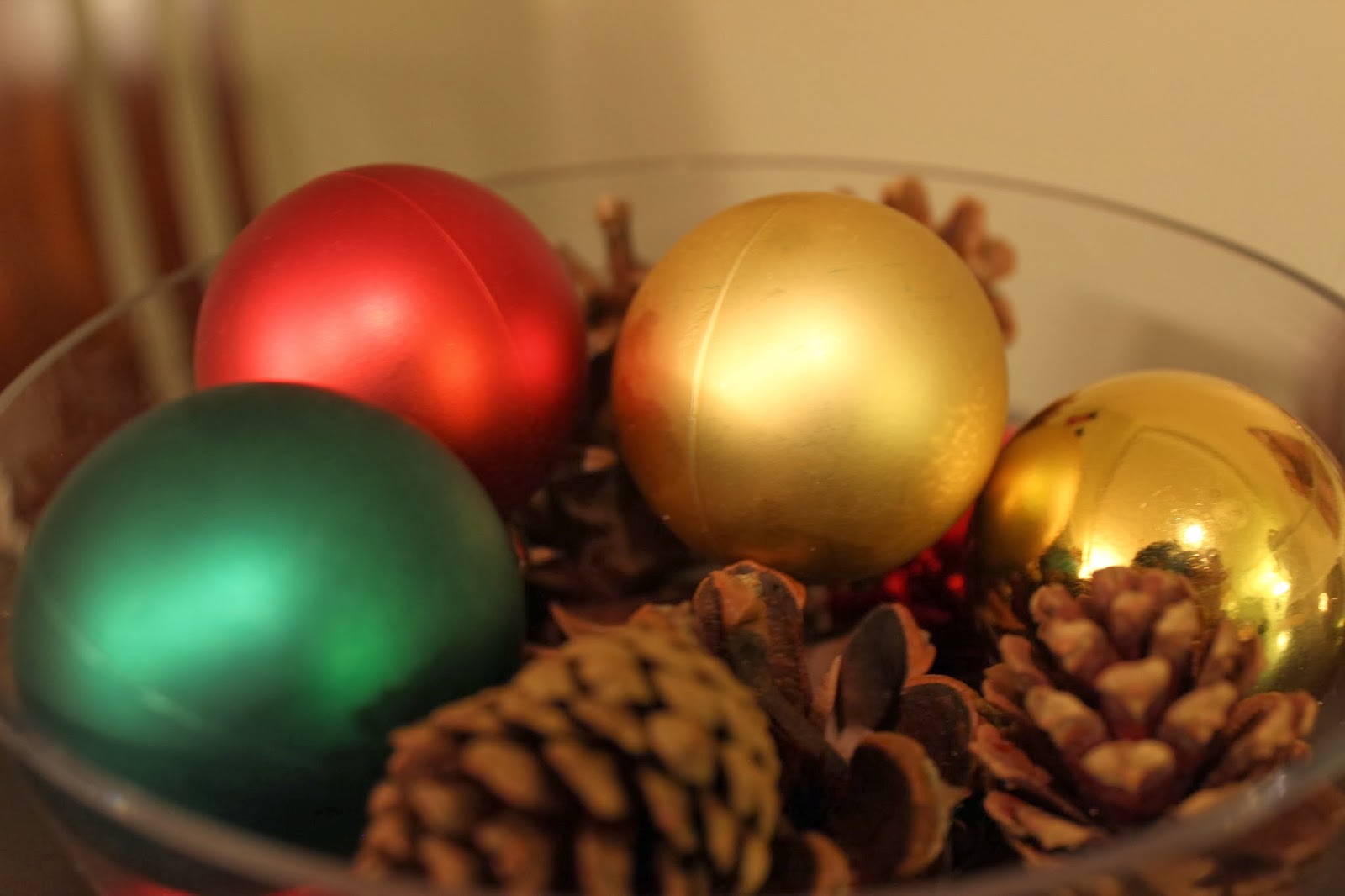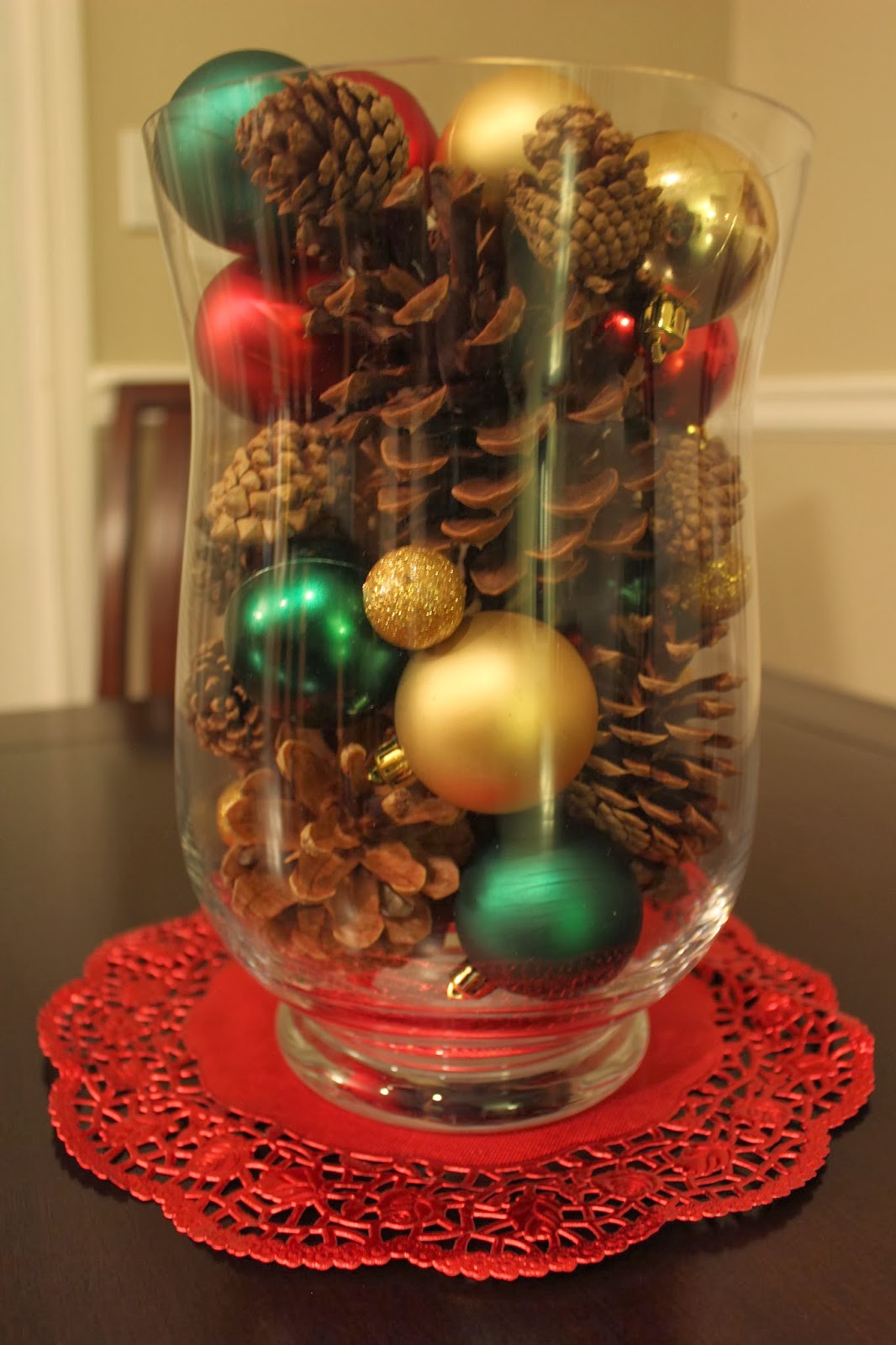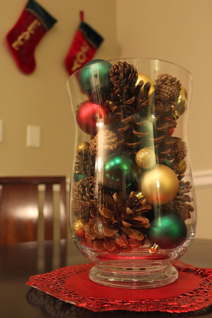 Some mini pinecones, some HUGE pinecones, some leftover ornaments, some tiny glittery decorations, some red place settings…