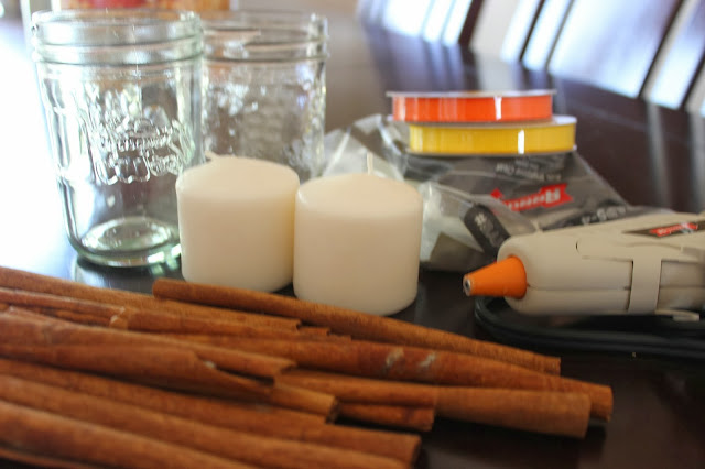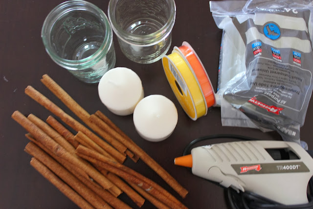 Tools: mason jars, cinnamon sticks, glue gun, unscented candles. (and anything you want to embellish with)