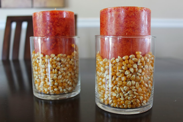 Crafts actually don’t get easier than this! All I did was put popcorn kernels around some orange candles. Added the perfect touch to my mantle!