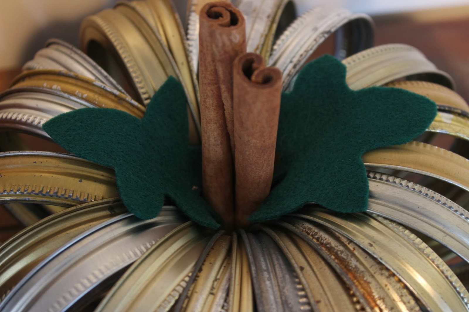 Tools: mason jar lids. Felt (or anything for leaves), Cinnamon sticks. String to attach lids.