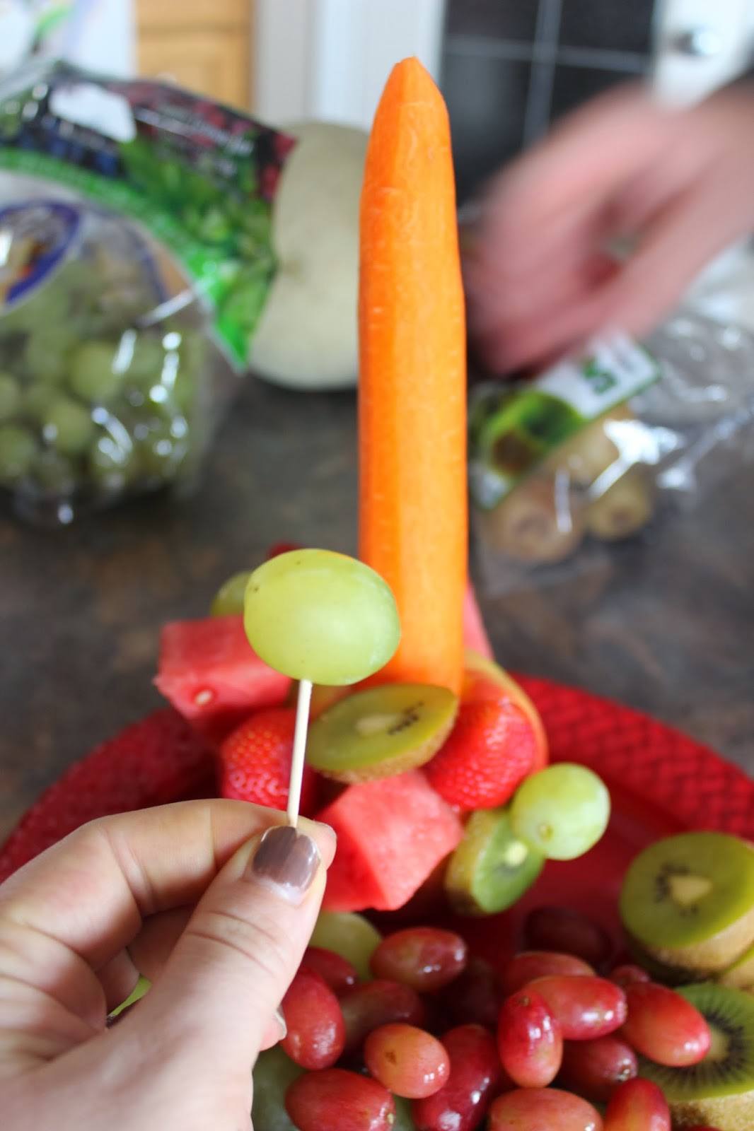 Step three: Cut up all the fruit you want to use, and stick each piece on a toothpick to be inserted onto the apple/carrot structure.