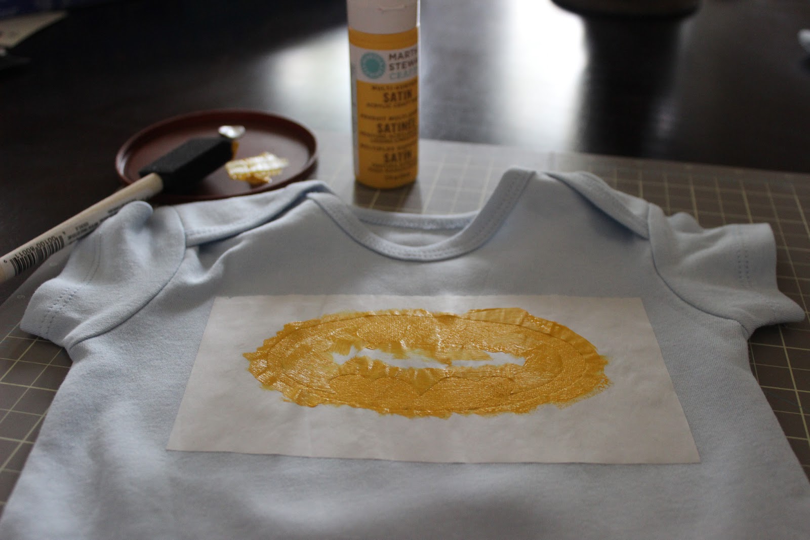 Then I cut a peice of freezer paper to put behind it (in the middle of the onsie). That way the paint won’t bleed through to the other side of the onsie. Then you iron on the freezer paper. Both the front stencil, and the piece in the middle will adhere nicely to the onsie.