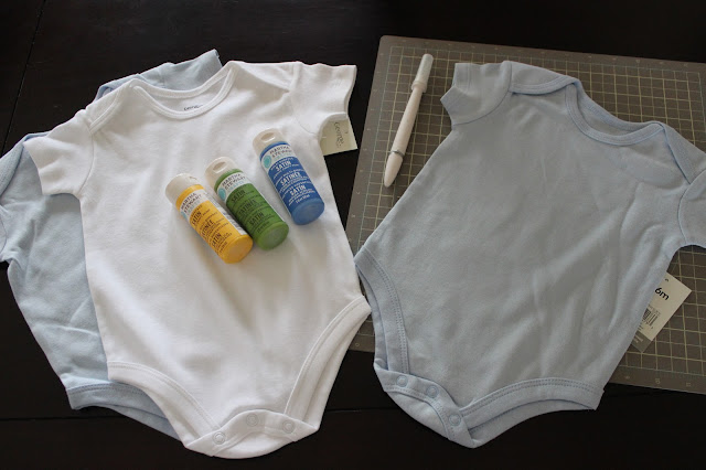 First I bought fabric paint, and lots of onsies in different sizes (0-3 mos, 3-6 mos, etc.).