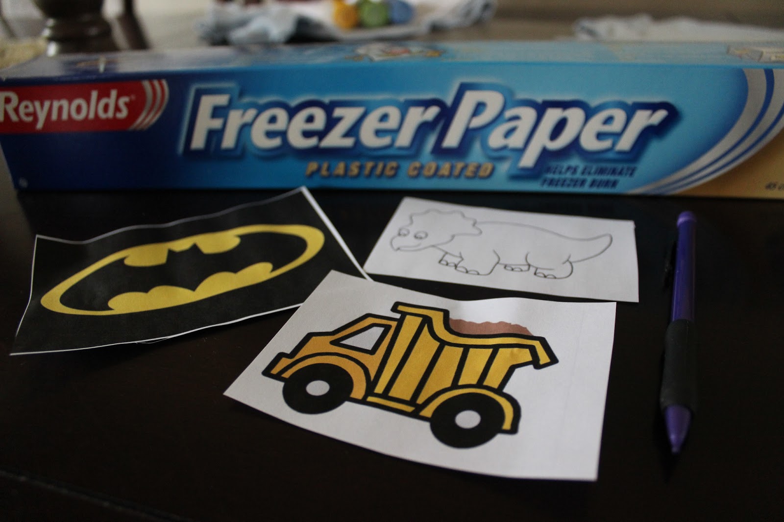 We printed pictures off of the computer, and traced them onto Freezer Paper (found in your local grocery store!). Then I used my crafting knife to cut out the parts of the shape that I wanted to paint.