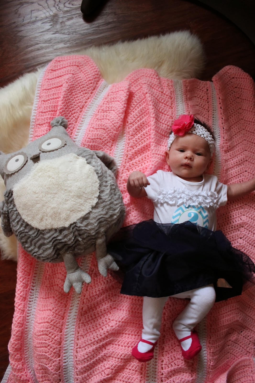 Her dark blue eyes have started to lighten. She never lost one hair from her head. Her dark brown colour has lightened ever so slightly. She’s starting to show off some strength in those legs of hers, pushing against us and holding her body up for a few effortful seconds. She’s smiling at mommy and daddy all the time. She sleeps for a six hour stretch, and even the occasional overnighter (Hallelujah!), but protests naps like its her job. She had her first cold last week. She’s already wearing her 3 month clothes. She follows people around the room with her eyes, and demonstrates some serious head control. She is demanding. She knows what she wants and doesn’t stop until she gets it. She has had play dates with lots of different little friends, although she’s primarily just a passive observer of these events :)