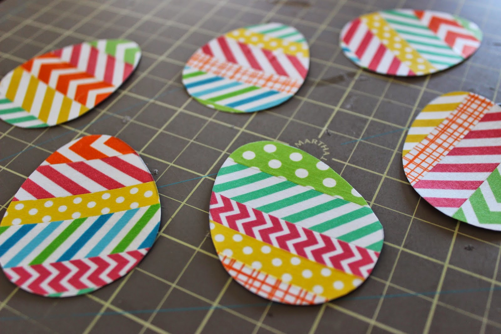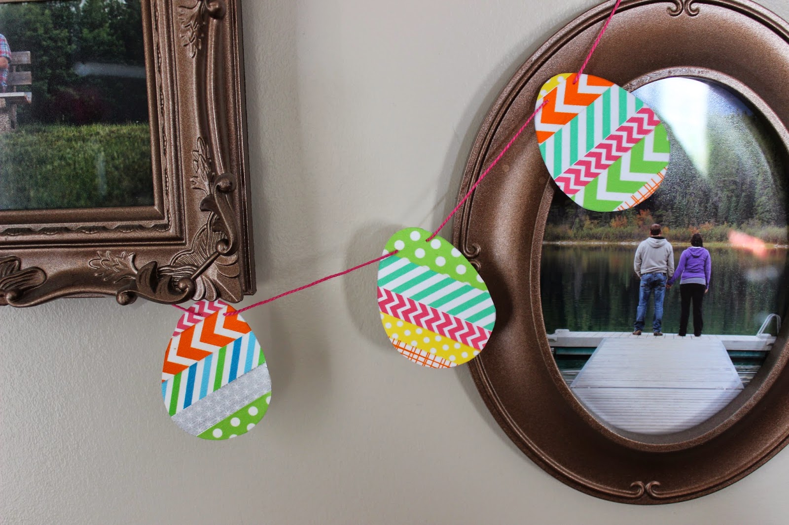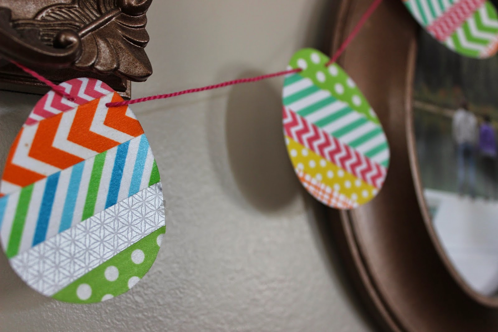 I had so many nice Spring washi tape colours and I knew I needed to do something decorative with them. So I found this egg pattern, printed it, and covered the eggs with washi tape for a festive Easter garland.